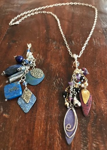 Do you have missing earring mates that have been sitting in your jewelry box and you have no idea what to do with them? Maybe you have an old necklace that was a gift that you were never crazy about and never wear but can't bring yourself to get rid of it. Why not let us recreate those odds and ends into a new sparkling creation? Below is a photo of just that. Eve from Ohio sent us a bunch of earrings she lost the mates to and they were just sitting in her jewelry box so we recreated interchangeable pendants out of those earrings!